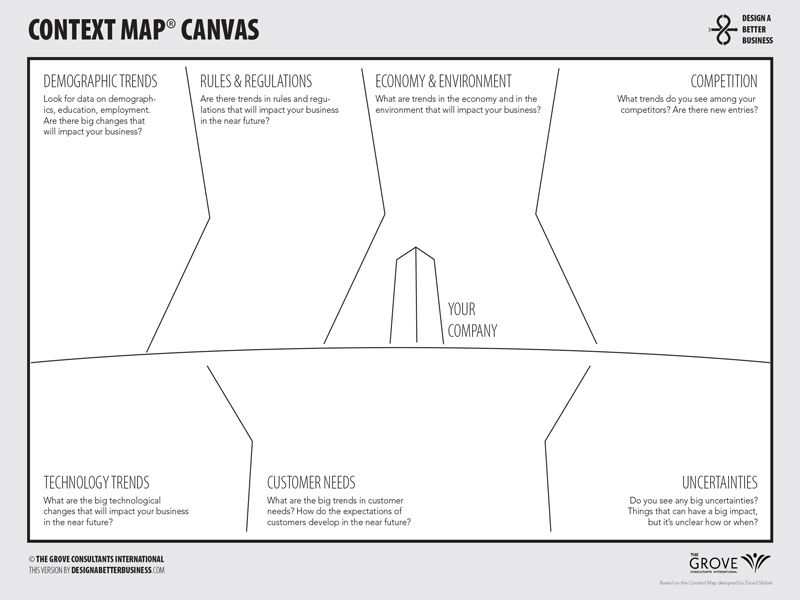 Context Map Canvas چارچوبی است که به شما کمک میکند دنیای اطراف کسبوکار یا تیم خود را درک کنید. اینها چیزهایی هستند که شما هیچ کنترلی بر روی آنها ندارید. بر اساس آنچه برای کسبوکار شما مهم و مرتبط است، ممکن است بخواهید نسبت به آنها طراحی کنید، اطراف آنها طراحی کنید یا به دور از آنها طراحی کنید. به راحتی میتوان تمرکز خود را روی چیزهایی که میتوانیم کنترل کنیم، درون دیوارهای خودمان حفظ کنیم. این ابزار عالی برای باز کردن ذهن ما به روی رقابت، روندهای اصلی، پیشرفتهای فناوری، قوانین و مقررات، عدم قطعیتها و تمایلات در حال تغییر مشتریانمان است.
