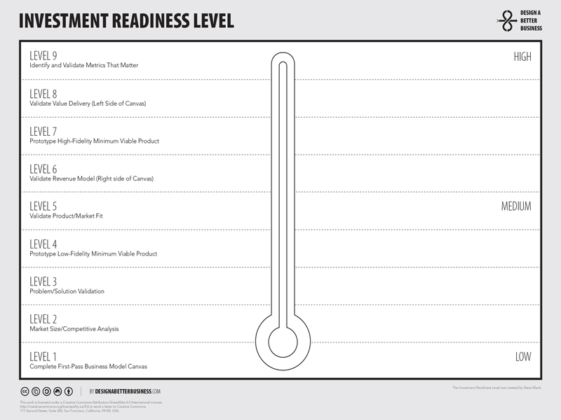 پروژه، محصول یا شرکت در چرخه عمر خود کجاست؟ مانند تمام بومها، سطح آمادگی سرمایهگذاری به گونهای طراحی شده است که امکان گفتگوی غنی و استراتژیک را فراهم کند، در این مورد، با استفاده از مجموعه معیارهای رایج، مربوط به مدل کسبوکار پروژه، محصول یا شرکت مورد نظر، به عنوان مبنای گفتگو این بوم نیز یک ابزار تجویزی است. صرفنظر از جایی که پروژه، محصول یا شرکت شما در فرآیند طراحی قرار دارد، نقطه عطف بعدی بلافاصله مشخص میشود.