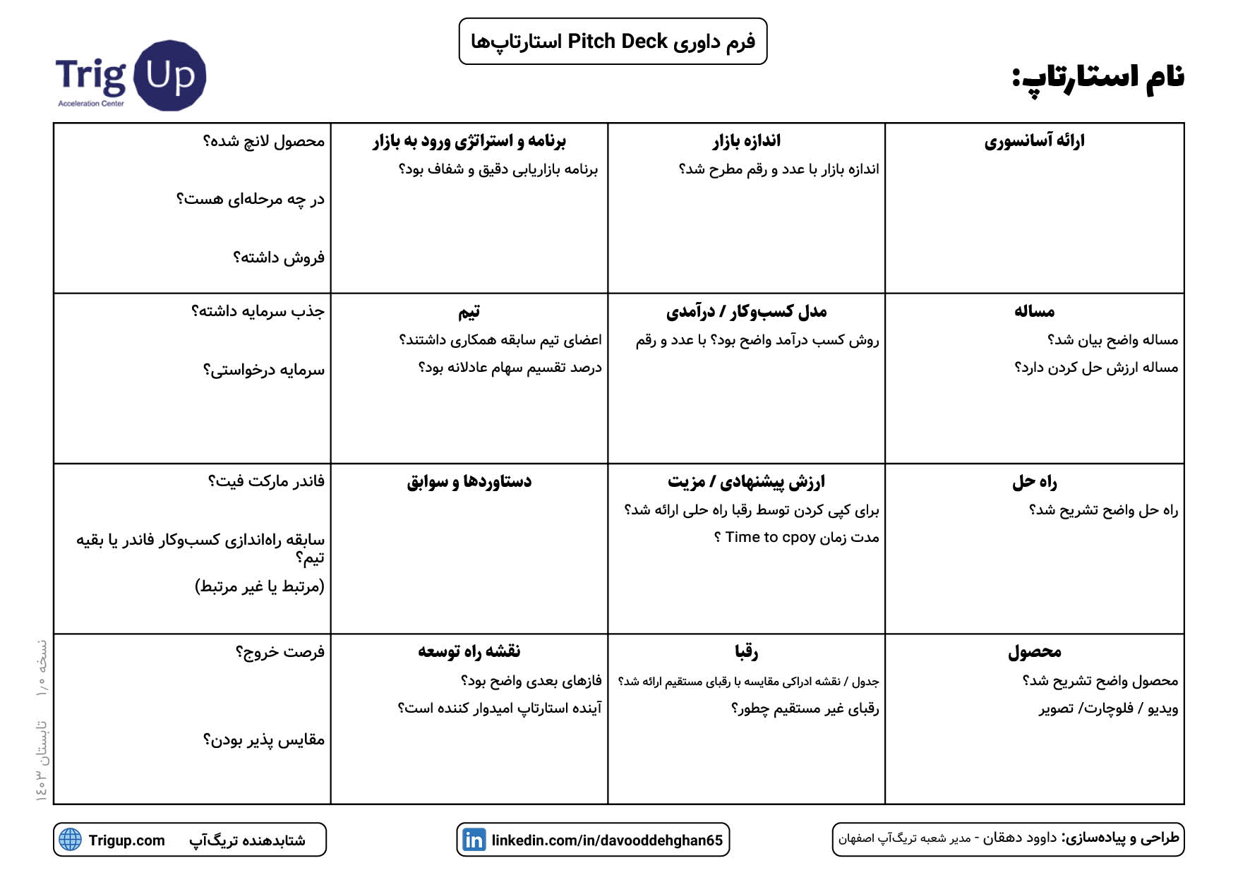 برای خودم که تا الان خیلی کاربردی و مفید بوده، دوستانی که با داوری استارتاپها و ایدهها سروکار دارند احتمالا به دردشون بخوره، خواستید ایمیلتون رو بگذارید تا فایل PDF با کیفیت پرینت رو براتون ارسال کنم.